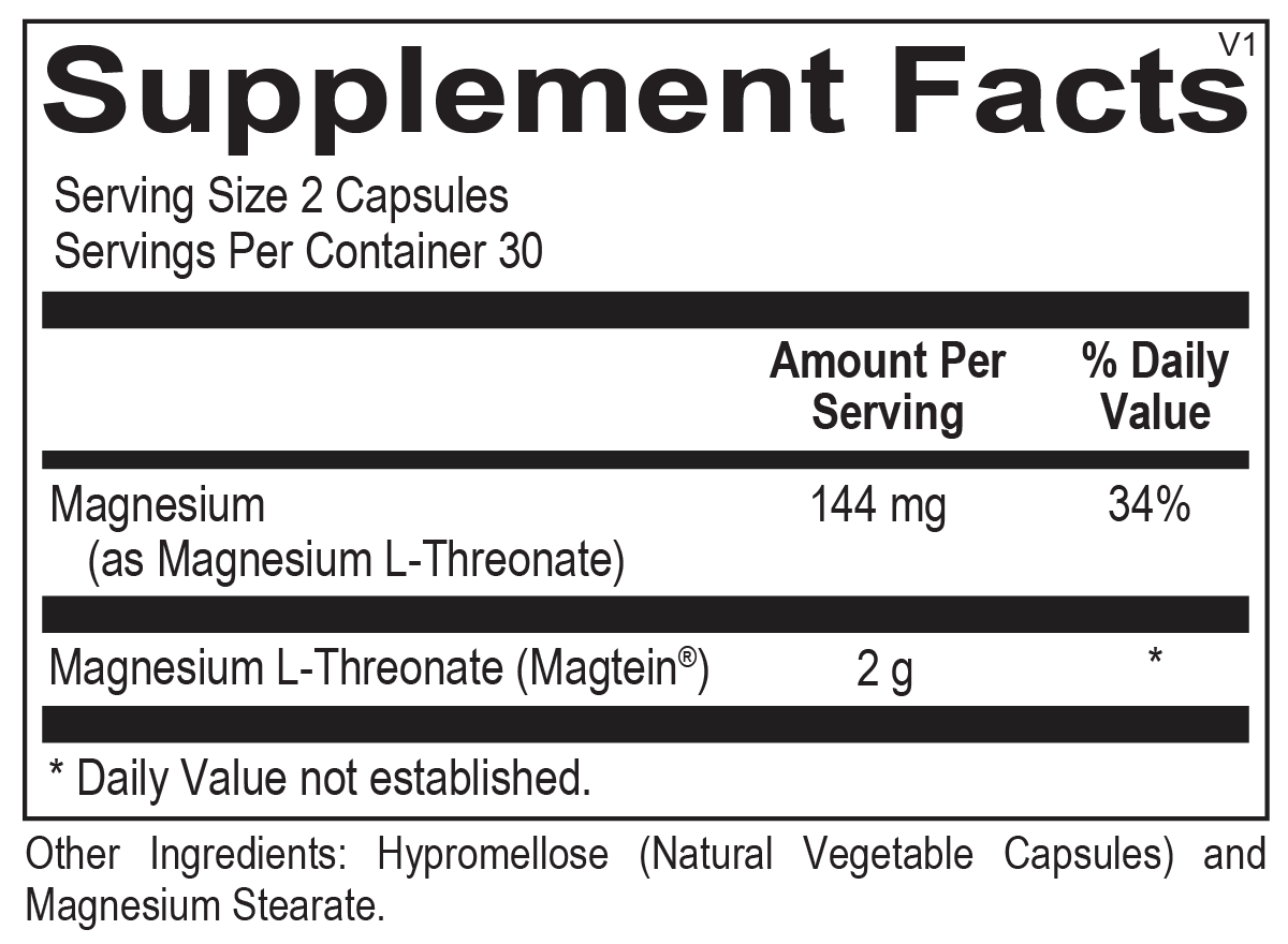 Magnesium (as Magnesium L-Threonate): 144 mg (34% DV)